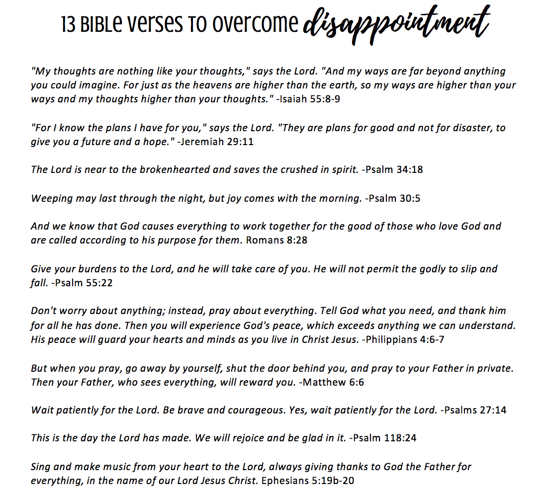 Download this printable version of the blog post 13 Bible Verses to Overcome Disappointment. The printable includes only the verses, not the commentary from the post, to minimize paper and ink usage. Use the printable to help you study, meditate on, and memorize the verses to hide in your heart for the next time you feel disappointment spilling over in your heart.