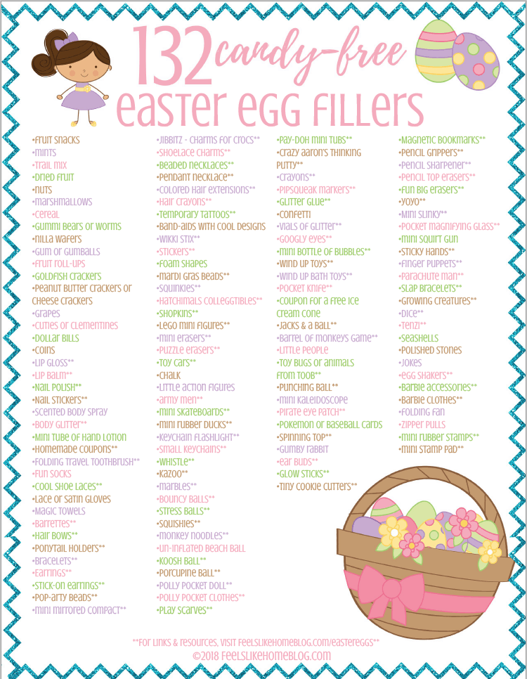 This cute printable offers over 130 unique and creative NON-CANDY fillers for Easter eggs of all sizes, from very large to very small, and for all children, from babies up through teens and maybe even adults. (Who wouldn't want to find some cash in their eggs?)