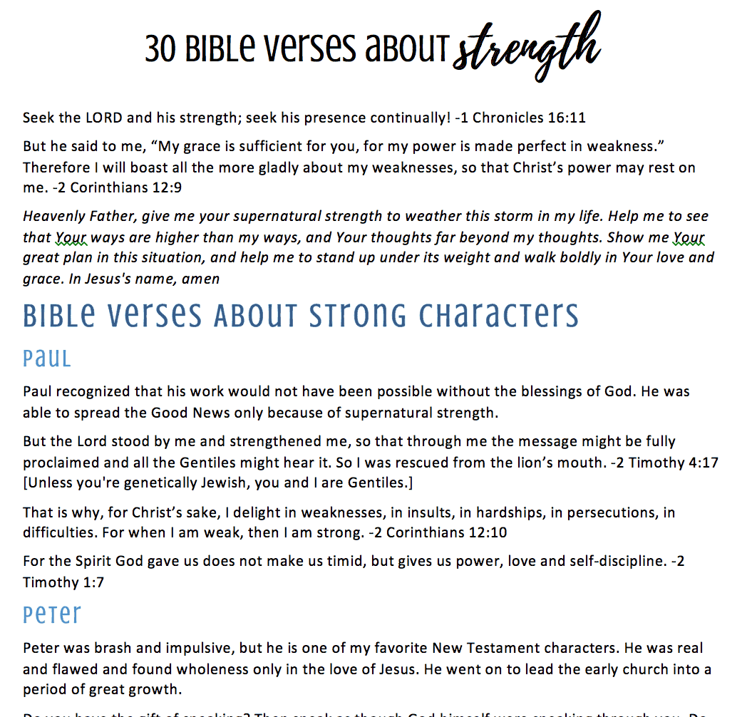 Download this printable version of the blog post 30 Bible verses on strength. The printable includes only the verses and the prayer, not the commentary from the post, to minimize paper and ink usage. Use the printable to help you study, meditate on, and memorize the verses to hide in your heart for the next time you feel hopeless and the need for strength.