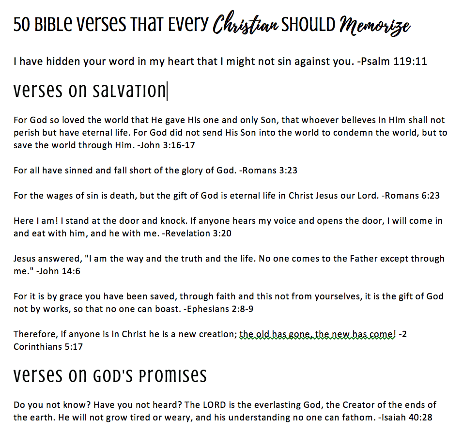 Download this printable version of the popular blog post 50 Bible Verses Every Christian Should Memorize. The printable includes only the verses, not the commentary from the post, to minimize paper and ink usage. Use the printable to help you study, meditate on, and memorize the verses to hide in your heart.