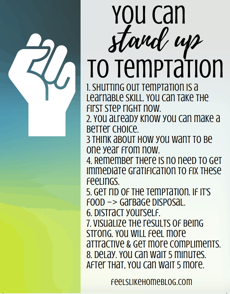 This single page, full-color printable lists 8 tips and thoughts that you can use to resist temptation when it strikes. I created it with food addicts in mind, but it suits for a variety of different circumstances. For more information, see this blog post on temptation.