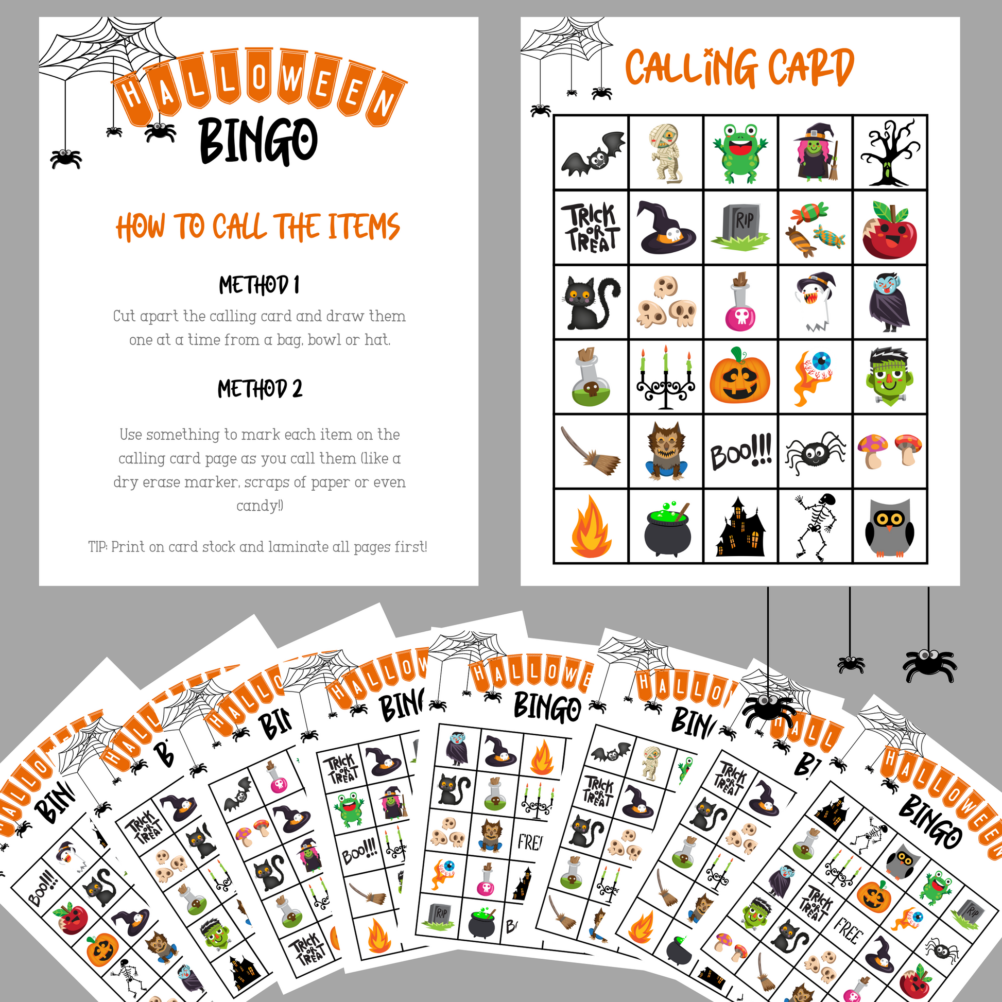 The download contains 10 8.5"x11" pages including 8 unique bingo cards, one page of calling tiles, and one page of instructions.